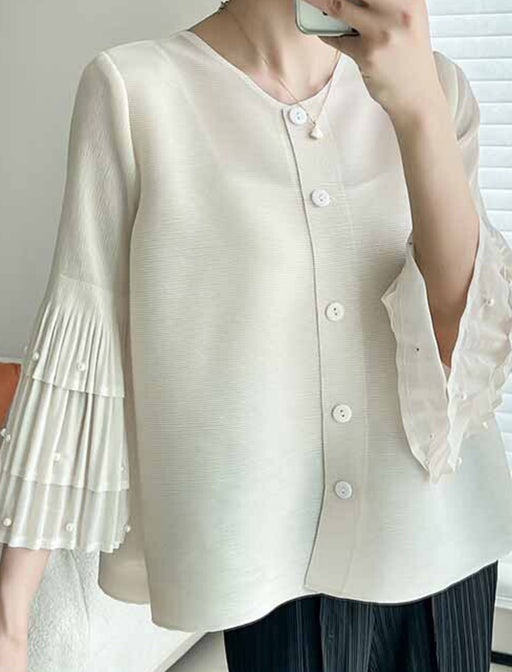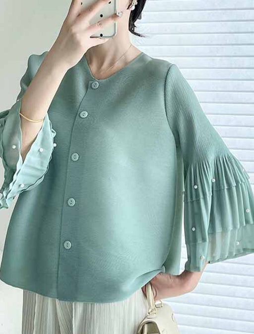ふとした動作のたびにパールが上品に煌めき、プリーツの柔らかな揺れが女性らしさを引き立てます。 短めの丈感で、ロングスカートやワイドパンツとも相性抜群。 オフィスからホテルでのランチまで、どんなシーンでも自信を与えてくれる主役級アイテムです。