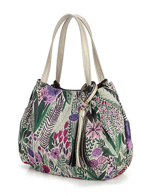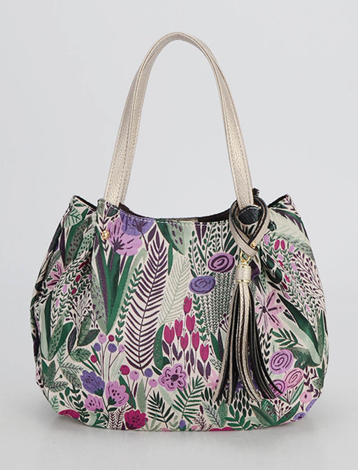 繊細な草花が描かれた、上品な華やかさ漂うトートバッグ。 落ち着いたトーンの多色展開で、どんな装いにも優雅に寄り添います。 軽量で収納力もあり、デイリーから旅行まで主役級の存在感を放つアイテムです。
