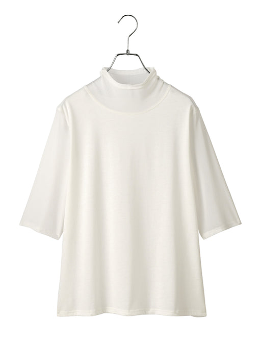 Tシャツの動きやすさとブラウスの上品さをいいとこ取り「Tブラウス」 繊細な表面感のカットソージョーゼットを使い、胸元のデザインを重ね着風に仕立てています。 パール調ボタンをタック袖にも施し、手元の仕草も品良く美しく。