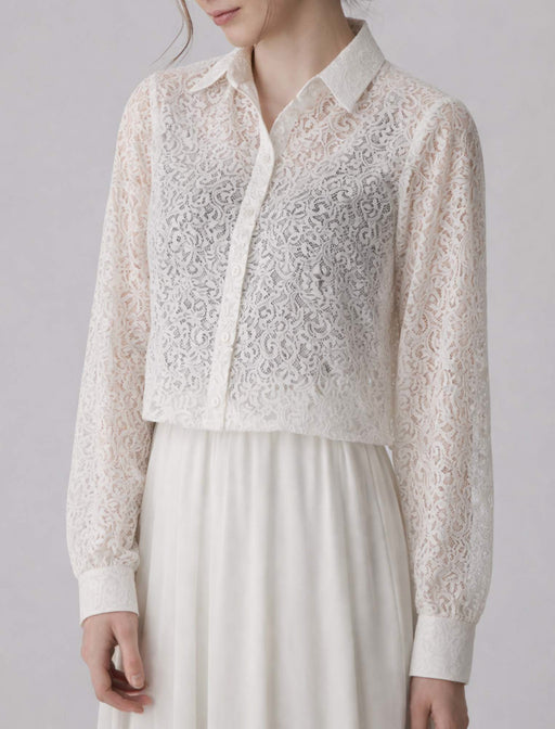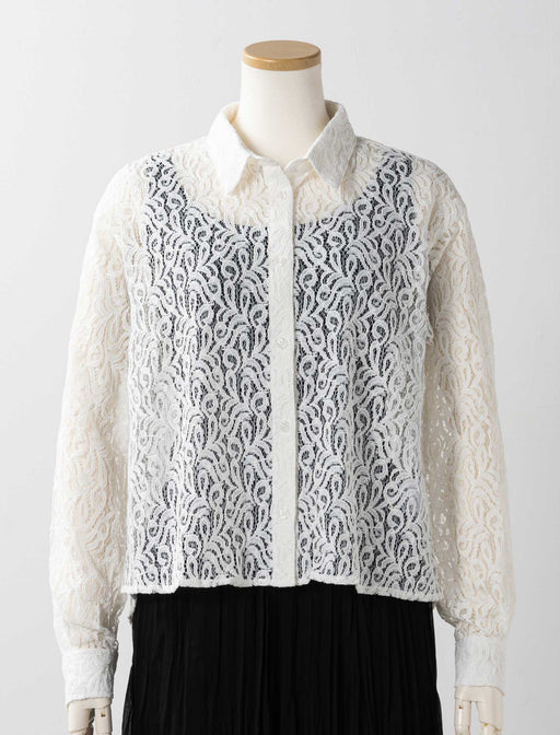 ラメ糸を編み込んだニットカーディガンは、エレガントな雰囲気で体型をカバー。 波打つようなトッパーラインで、襟から裾まわりにかけて繊細な透かし編みを施しています。 総レースブラウスは裏地付きで、袖口と裾はスカラップ仕上げと細部までこだわった一枚です。