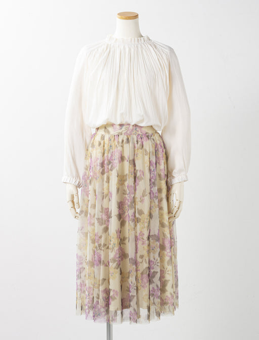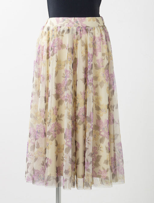 繊細なチュールにニュアンス感のある花柄をプリント。 内側の柄が透けるレイヤードデザインが、歩くたびに奥行きのある表情を作ります。 落ち着いた配色で、大人の女性に似合う上品な華やかさを叶える一着です。