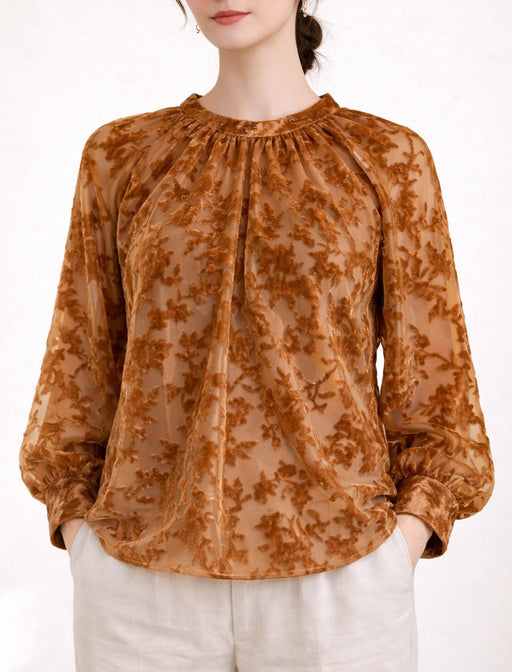 心ときめく「華」のある服。 ほのかな透け感とシボ感のある生地に、フロッキープリントのドット柄が可愛らしい雰囲気。 お揃いのシアースカートと合わせれば、より上品に、より都会的に旬のコーディネートが完成。
