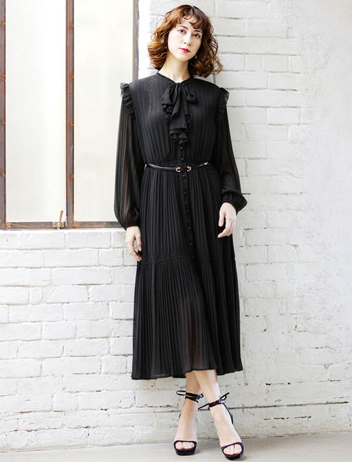 フリル、リボン、ティアードとフェミニンなディティールを取り入れつつ、大人っぽく仕上げたプリーツワンピース。 高めの切り替え位置から広がるティアードが、脚長効果を演出。 ボリューム感のあるティアードデザインが体型をカバーしつつ、旬のシルエットを叶えます。