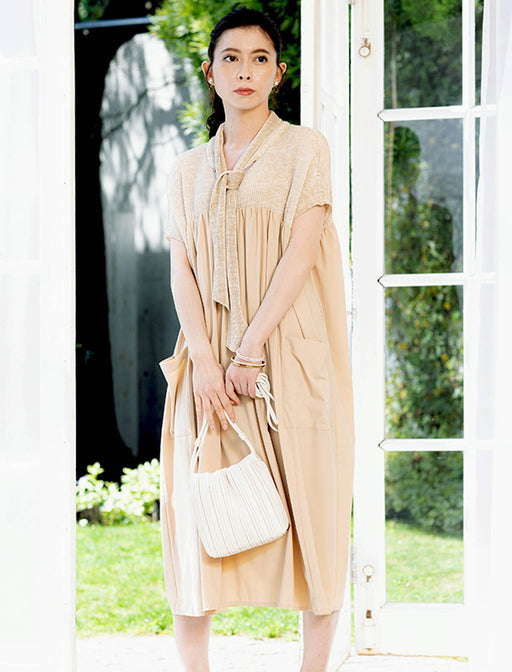 水彩画のような濃淡とかすれた配色が美しい、秋冬の主役級ワンピース。 衿元と袖はあたたかみのあるニット素材で切り替え、シーズンムードをさりげなくプラス。 裾にかけて広がるティアードデザインとたっぷりとした生地使いが、歩くたびに美しい揺れ感を演出します。