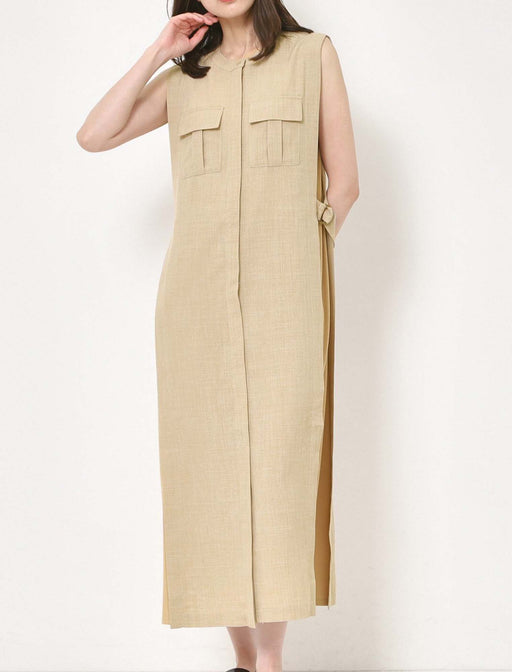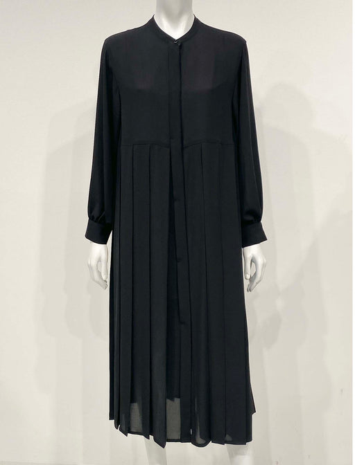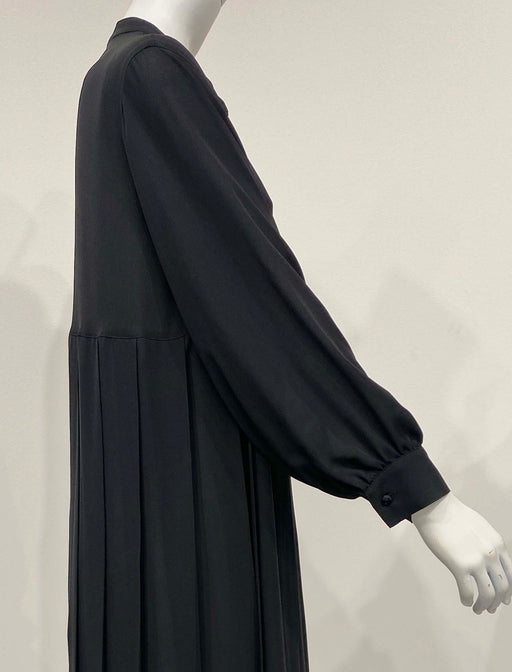 サイドプリーツが美しいラインを生み出す上品ワンピース。 ふわりと柔らかくしなやかなデザインと、程よい透け感を併せ持つレトロな素材感も魅力的。 体のラインを拾いにくい機能的なデザインでバックスタイルも抜かりのないスタイリングに。