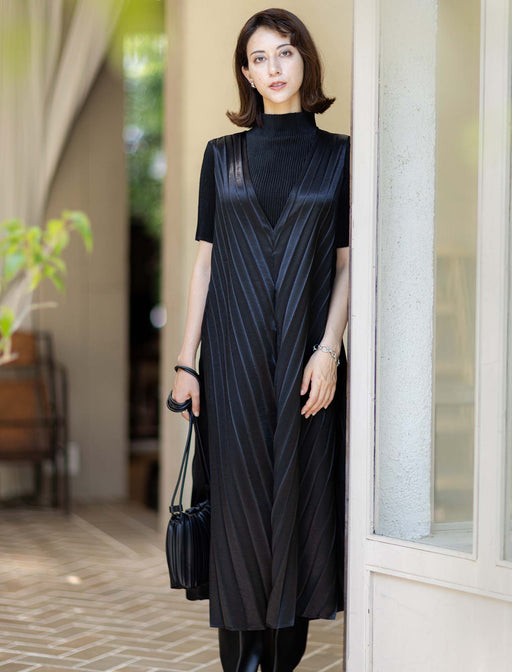 優雅な揺らぎを纏う、ジャンパードレスの新定番。 しっかりめのヴィンテージサテン調素材にアコーディオンプリーツをかけることで、しなやかなレザープリーツのような風合いが魅力。 身体のラインを拾いすぎない、絶妙なシルエットが大人の洗練された雰囲気を後押ししてくれます。