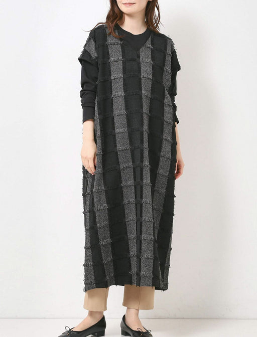 背中で印象を変える、切り替えデザインのロングワンピース。 チェック柄の大胆なアクセントで、後ろ姿まで抜かりなしのスタイルを。 足元まで美しく落ちるロングラインで、大人のリラックスタイムをお洒落に楽しんで。