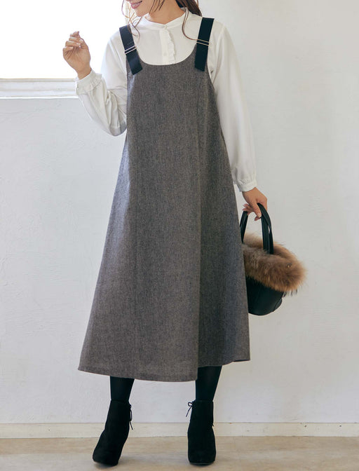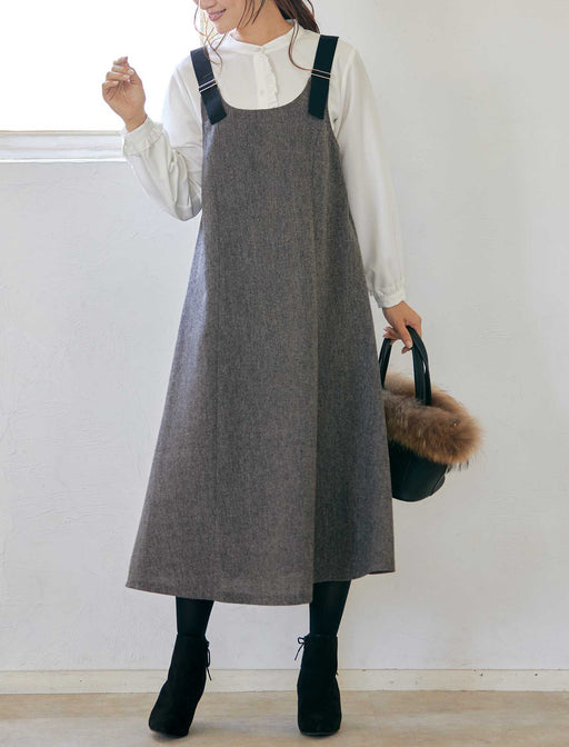 肩ベルトデザインが大人に似合うジャンドレ。ツイード調の織り生地がシックな雰囲気で、肩ベルトが装いのアクセントに。胸元から広がるフレアーシルエットはおしゃれに体型をカバーしてくれます。