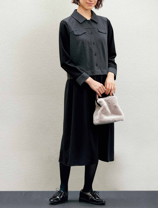 ブルゾン風コーディネートが一枚のワンピースで完成。 トップス部分に襟や前立て、フラップを施し、ウエスト位置からスカートをつなげたドッキングワンピース。 カットソーと合繊生地を巧みに切り替え、着やすさにも配慮しています。