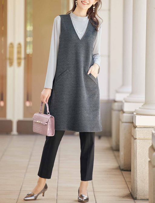 ラクしてすらり、大人のジャンパードレスで上品な甘スタイルに。 胸元をすっきり見せる深めVネックと、体型をカバーするゆったりシルエットがポイント。 リブの太さを巧みに変えたニュアンスのある表情で、無地ながらもお出かけ感の高い一着に。