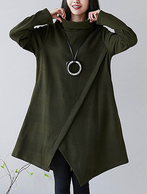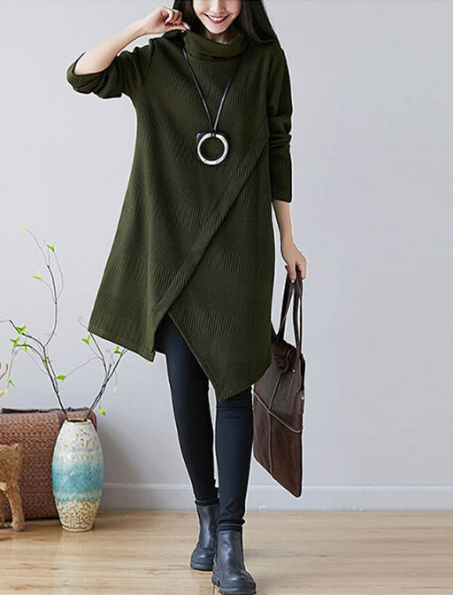 オフタートルとアシンメトリーデザインがポイントのチュニック丈ワンピース。 首まわりをやわらかく見せつつ、動きのある裾ラインでさりげなくおしゃれを演出。 レギンスやパンツとの重ね着も楽しめ、デイリーからお出かけまで活躍する一枚です。