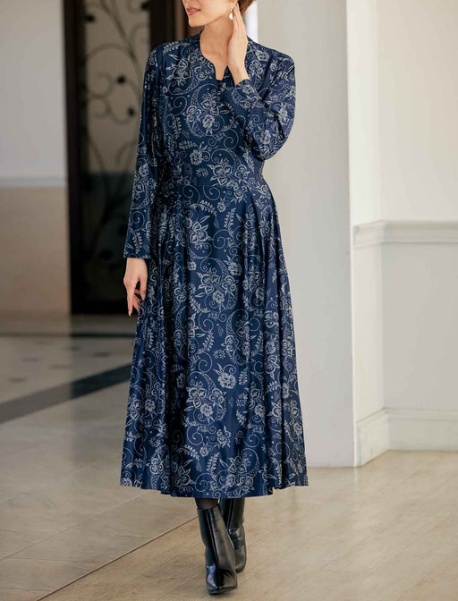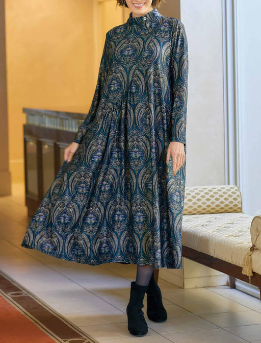 更紗紋様の美しさと流麗シルエット。 落ち感がきれいなストレッチジャージー素材の総柄ワンピース。 ウエスト切り替え位置もタック分量も計算されたデザインが、流れるようなドレープ感を生み出し、脚長&スマートに見せてくれます。