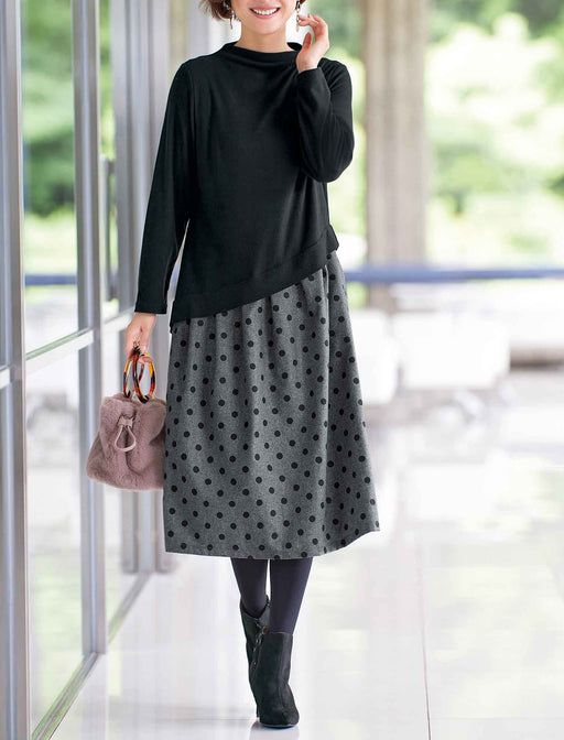 ドット柄が優しく躍るドッキングワンピース。 肌ざわりなめらかなカットソートップスと、ぬくもりあるウール混のスカートがドッキングしたワンピース。 ゆったりとした着心地でも、斜めラインの切り替えがスタイルアップして見せてくれ ます。