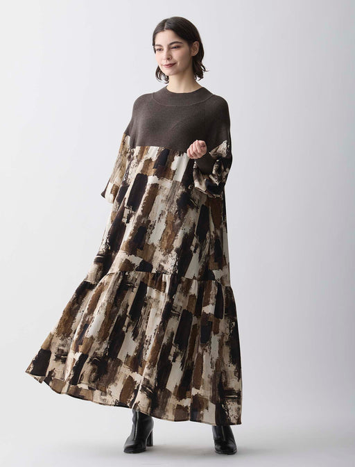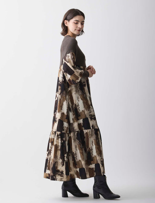 水彩画のような濃淡とかすれた配色が美しい、秋冬の主役級ワンピース。 衿元と袖はあたたかみのあるニット素材で切り替え、シーズンムードをさりげなくプラス。 裾にかけて広がるティアードデザインとたっぷりとした生地使いが、歩くたびに美しい揺れ感を演出します。
