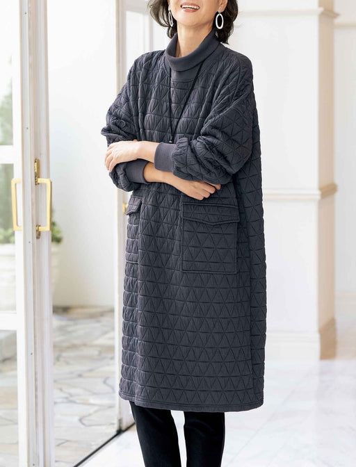 すっぽり着てリラックス気分、コクーンワンピース。 凹凸感があるやわらかタッチのふくれジャカードカットソーは、快適な着心地。 前身頃のウエスト切り替えにポケットを配したシンプルデザインで、丸みのあるシルエットが自然に体型をカバーしてくれます。