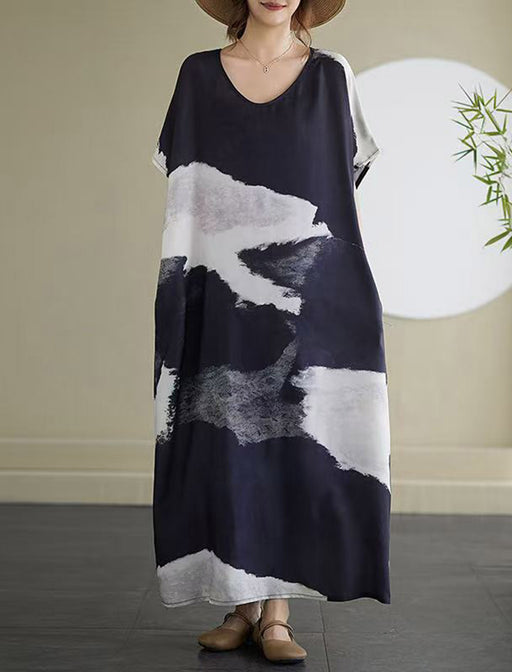 大胆なモダンプリントが印象的なワンピース。<br>ゆったりとしたシルエットでリラックス感があり、日常使いにもお出かけにもぴったりです。<br>軽やかな素材感で、動きやすく快適な着心地を提供します。