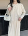 パール使いが上品に映える、ツイード調カーディガンとワンピースのセットアップ。