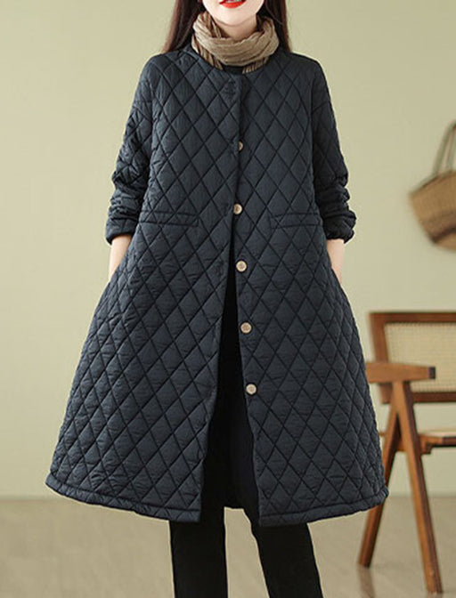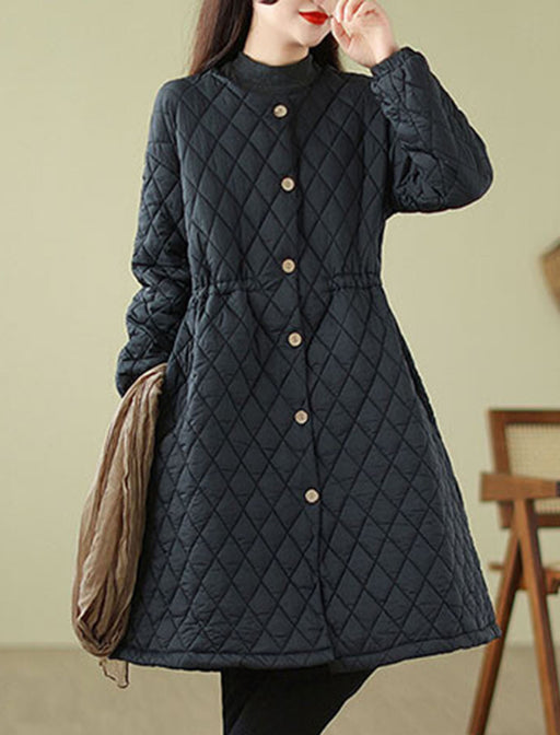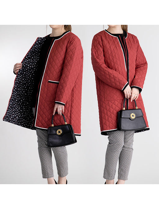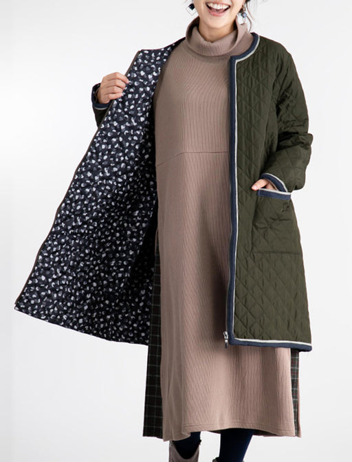 ひょうたん型のキルティングデザインが印象的なノーカラーコート。<br>中綿入りで軽やかなのに暖かさをしっかりキープします。<br>すっきりとしたノーカラーデザインは、インナーを選ばず幅広いスタイリングにマッチ。