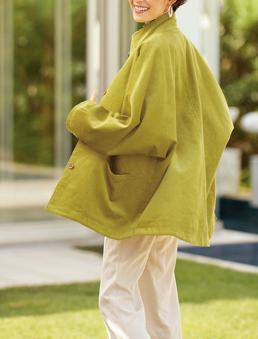 全方向から美形に着映えるドルマンコート。 明るい気分を誘う色合いのコーデュロイ素材で、肌寒い時期から活躍。 後ろが長いゆったりシルエットは、ボリューム袖トップスの上からもゆったり着られます。