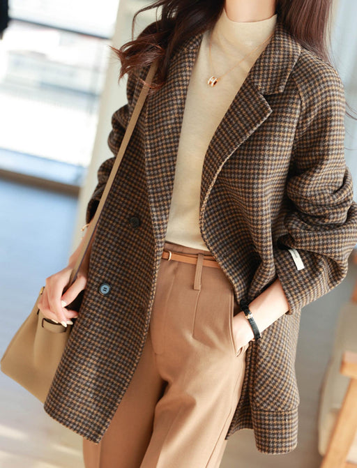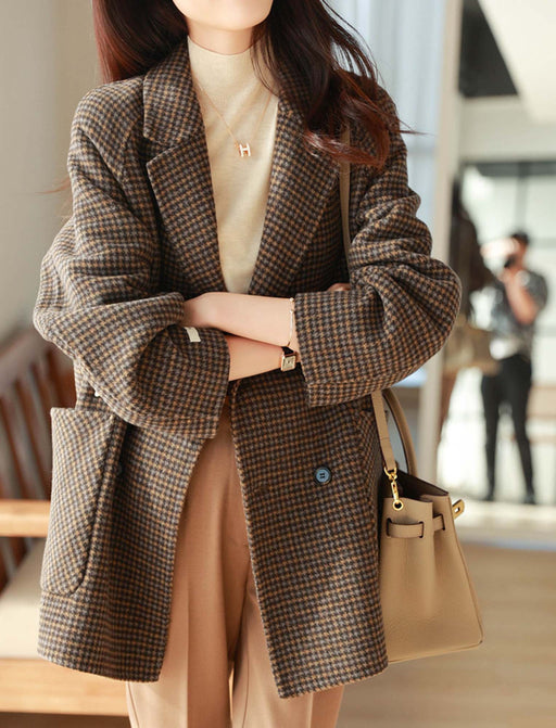 クラシックなチェック柄が印象的なハーフコート。<br>ジャケットのようなきちんと感を持ちながら、ややゆったりとしたシルエットで軽やかに羽織れるデザインです。<br>カジュアルからきれいめスタイルまで幅広く合わせやすく、大人の洗練された装いを演出します。