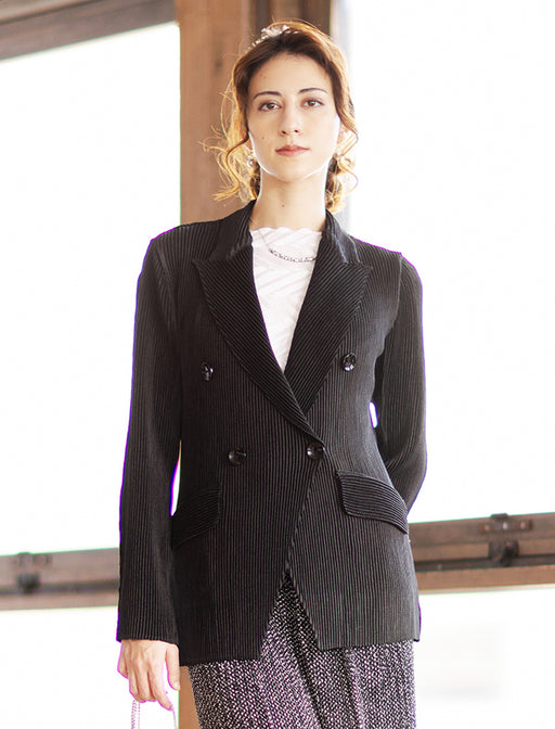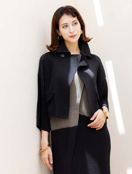 動きに合わせて揺れる、軽やかクロップドジャケット。 シャトルプリーツのしなやかな伸縮性と、計算されたクロップド丈がモード感と抜け感を演出。 ゆったりと羽織ることができるので、ルーズシルエットのワンピースや厚手のニットに合わせても◎