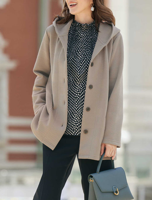 洗練されたモダンさと着心地の良さの両立。 カーディガン感覚で羽織れるカットソー素材のジャケットは、ジャガードのボーダー柄で洒落味をプラス。 フードが顔映えを叶えつつ、気になる肩まわりをカバーしてくれます。 シワになりにくいのも嬉しいポイント。