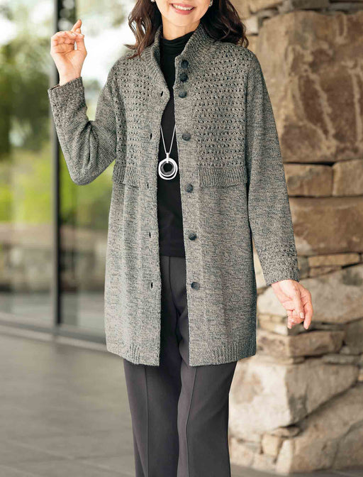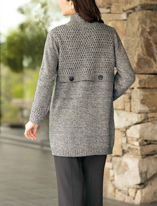 単調になりがちなニットアウターに変化をつけたジャケット。 同系色の杢糸を使用し、バスケット編みやウエストのリブ編み、表情豊かに変化をつけました。 バックのボタンアクセントなど、後ろ姿にも抜かりのない一着。