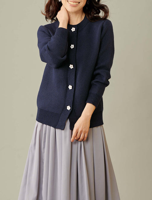 シンプルなニットジャケットに可愛らしい花モチーフのボタンを使用し、アクセントをもたせた一着。 ざっくりとした肉感に仕立てることで、甘すぎない旬の着こなしが楽しめます。 ボタンを閉めてトップスとしても、羽織りとしても着回しのきくアイテム。