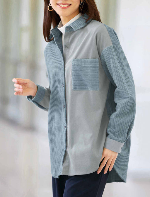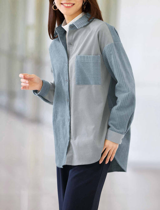 遊び心を効かせたコーデュロイシャツジャケット。 優しい配色や畝のピッチが異なるコーデュロイを使い、アシンメトリーに切り替えたデザイン。 風合いが良く、ジャケット代わりの羽織りとしても活躍します。
