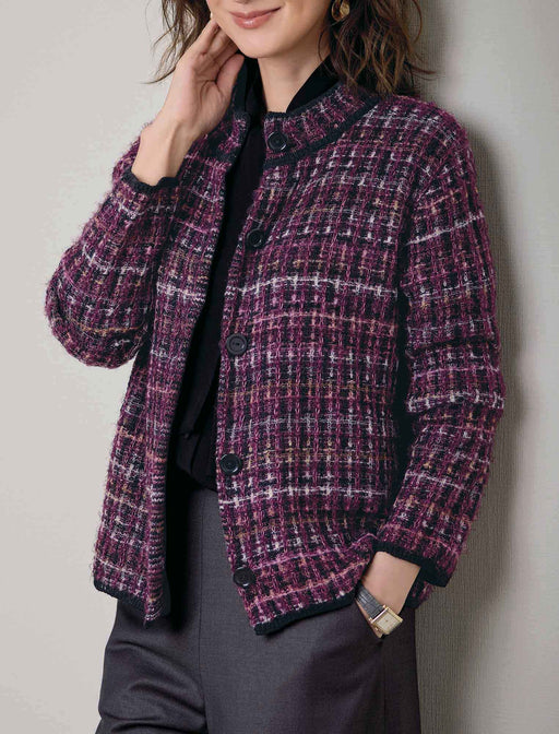 優美な装いを演出するウール入り格子柄ニットジャケット。 日本製のツイードニットジャケットは、伸びやかな着ごこちと上品な色合いが魅力。 衿元や袖口、裾は配色で引き締めてクラシカルな雰囲気に仕上げました。