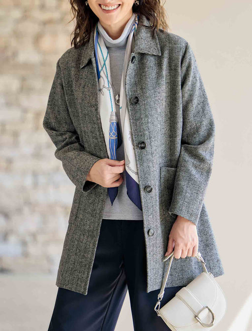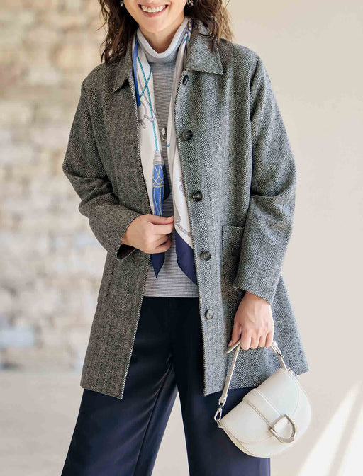 ほんのりオーバーサイズで、 きちんと感とこなれ感を両立。 オーセンティックなグレー系ヘリンボーン柄のジャケットは、ゆったりめのシルエットが今どき。 中に着るインナーを選ばず、着回ししやすいのも嬉しいポイント。