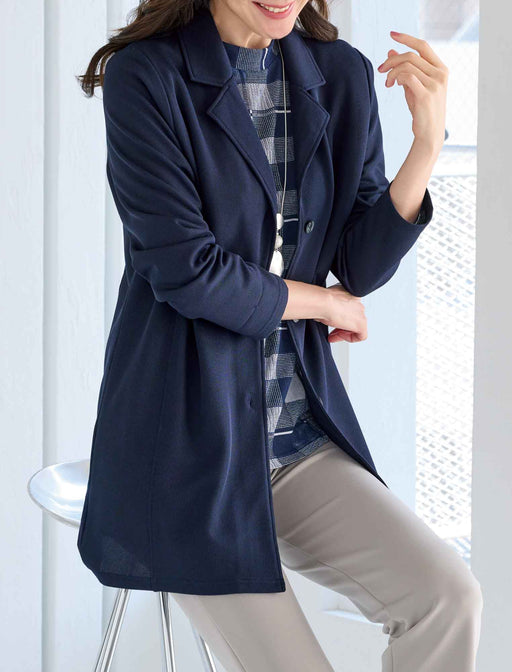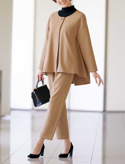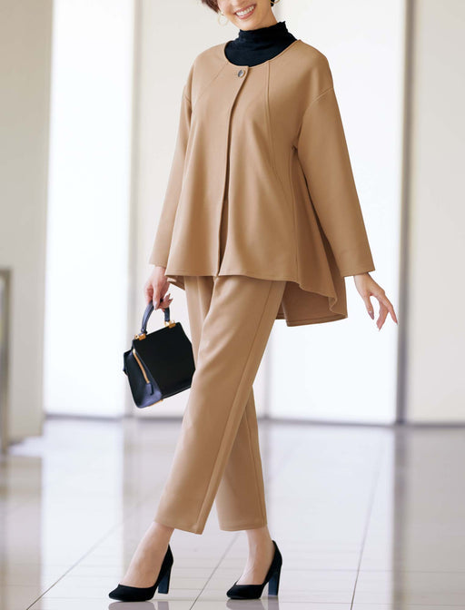 きちんと見えするテーラードジャケットアンサンブル。 しなやかな落ち感を持つ上質なカットソー素材を採用し、美しいドレープと洗練された印象を演出します。 お手持ちのインナーとも合わせやすい一着です。