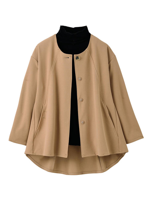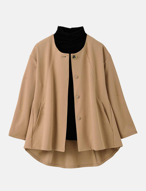 スタンド衿やコクーンシルエット、羽織るだけでトレンド感も高まるジャケット。 ストレッチ性のあるナイロン素材だから伸びやかで軽やか。 衿から続くタックやコクーンシルエットで細見え力も十分。
