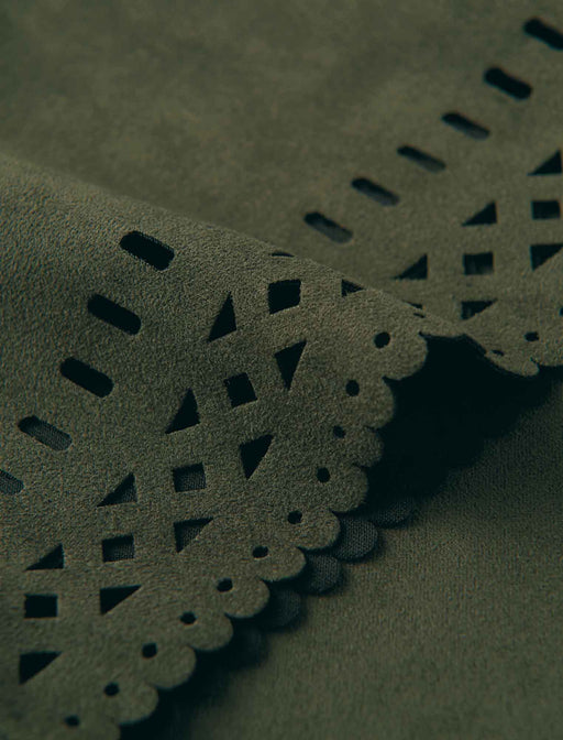 トレンドシルエットに、美ディテールを詰め込んで。 スエードタッチのジャケットは、腕をほっそり魅せるフレア袖やヒートカットなどフェミニンなデザインが素敵。 旬の丈感はボリュームのあるボトムとも好相性です。 ※ヒートカットとは、熱で生地をカットし様々な模様を出す手法です。