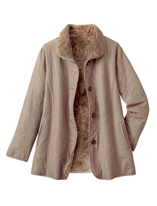 大人の魅力あふれる上品な装い。 衿と身頃、袖口裏のボア使いがふんわり暖かく着心地のよいジャケット。 表面にも裏面にも花柄があります。 袖部分のみすべりの良い裏地付で、袖も通しやすくなっています。