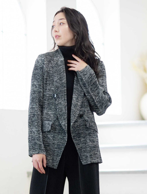 クラシックなドット柄がアクセントになったツイード調ジャケット。<br>上品なツイード素材に、程よい厚みと構築的なシルエットで、エレガントな印象を与えます。<br>ドット柄のアクセントが、シンプルなコーディネートに華やかさをプラスしてくれます。