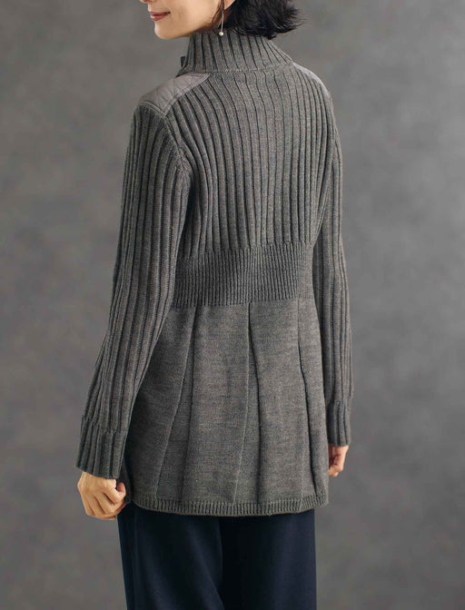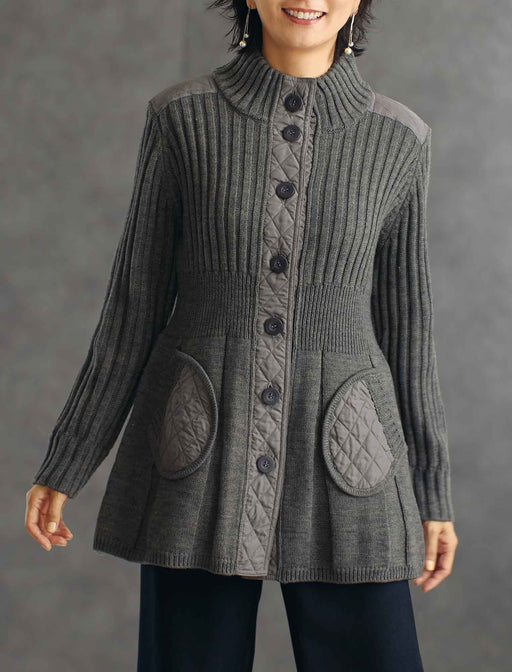 ニット&キルトが創り出す、自慢の美シルエット。 リブ編みから裾のフレアラインへ、編み地の変化で叶えたフォルムが美しいニットジャケット。 肩・前立て・ポケットを異素材のキルトで切り替えたデザインが可愛らしいアクセントになっています。