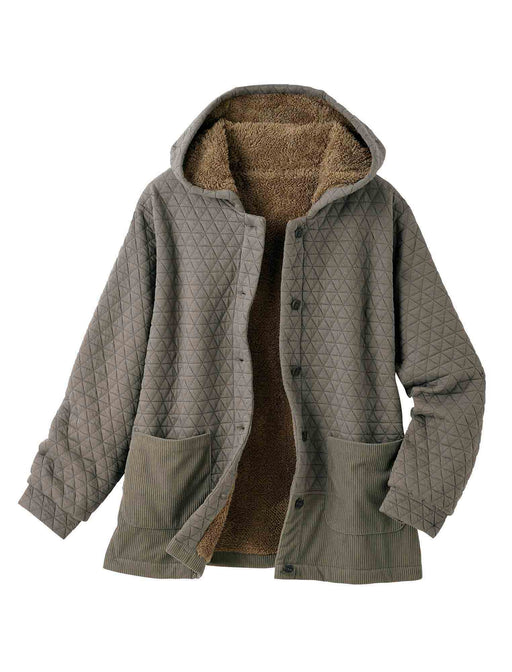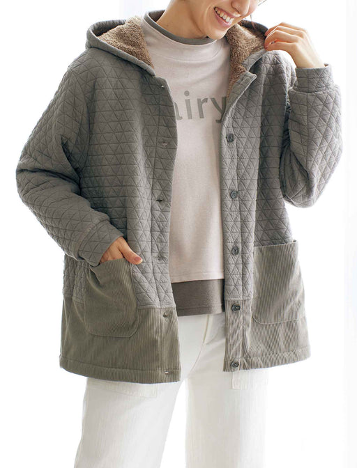 裏ボアでぬくぬく、やわらかキルト調ジャケット。 ソフトで動きやすいキルト調のカットソーを使い、身頃からフードの裏にふわふわのボアを施しているから暖かさ抜群。 ポケットと裾のコーデュロイ切替が素敵なアクセント。