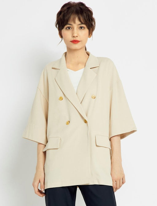 綿混カットソー素材で作られたテーラードジャケット。<br>布帛のように薄く、軽やかな着心地が特徴です。<br>ほのかに透けるエアリーな風合いと、ゆったりとしたシルエットがリラックスした印象を与えます。