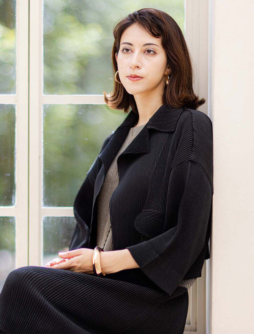動きに合わせて揺れる、軽やかクロップドジャケット。 シャトルプリーツのしなやかな伸縮性と、計算されたクロップド丈がモード感と抜け感を演出。 ゆったりと羽織ることができるので、ルーズシルエットのワンピースや厚手のニットに合わせても◎