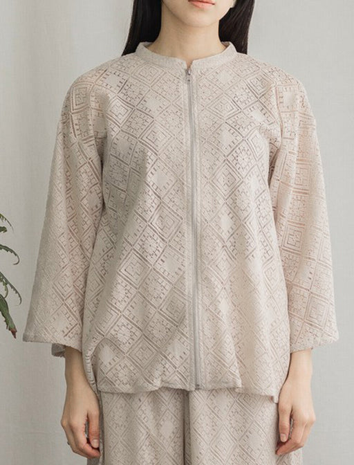 繊細な柄の総レースが上品な印象を与えるジップブルゾン。<br>軽やかな素材感で、さっと羽織るだけで華やかなスタイルに。<br>カジュアルからきれいめまで幅広いコーディネートにマッチします。