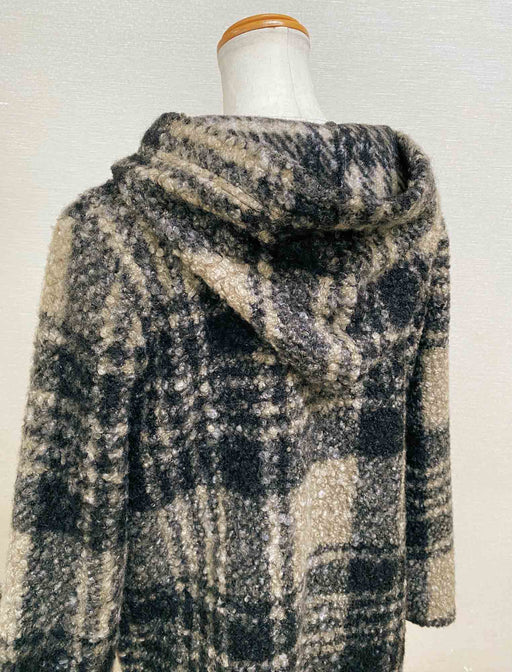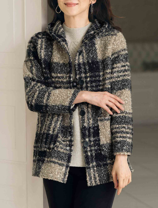 ライトな着心地と色合いでふだんにもお出かけにも活躍。 見た目も着心地もあたたかなふんわりとした起毛素材のコート。 配色のブロック柄が冬の着こなしを明るく見せてくれます。 フード風の大きめ衿もポイント。