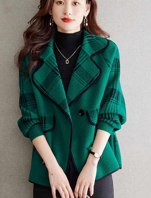 優美な装いを演出する、ウール入り格子柄ニットジャケット。 日本製のツイードニットジャ ケットは、伸びやかな着ごこちと上品な色合いが魅力。 衿元や袖口、裾は配色で引き締めて、クラシカルな雰囲気に仕上げました。