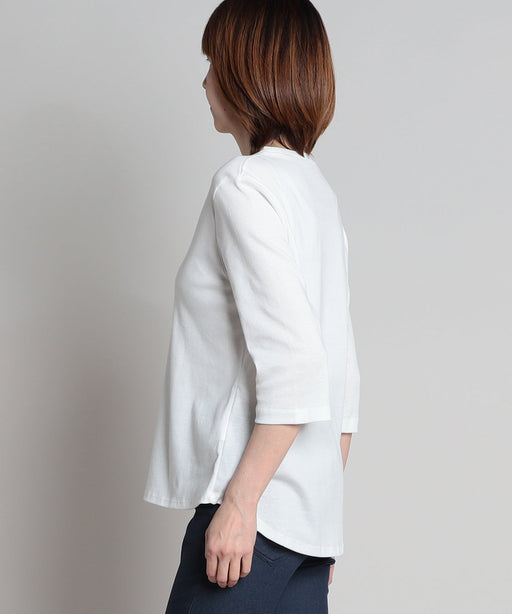 モダンな柄が目を引く七分袖チュニックプルオーバー。<br>衿と袖口に無地を切り替えることで、メリハリのあるデザインに。<br>胸元のピンタックやとろみ素材を生かした広がりのあるシルエットが、女性らしい軽やかさを演出します。