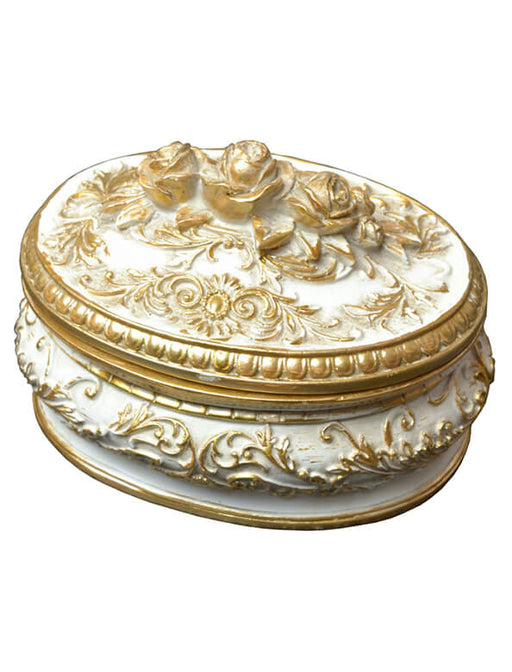 エレガントなゴールドローズの装飾が施された、クラシカルなオーバル型の小物入れ。<br>上品なデザインがインテリアに華やかさをプラスし、アクセサリーや小物を美しく収納できます。<br>程よいサイズ感で、リングやピアス、鍵などの大切なアイテムをすっきり整理。