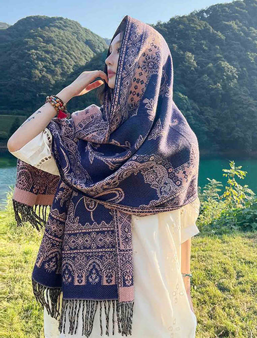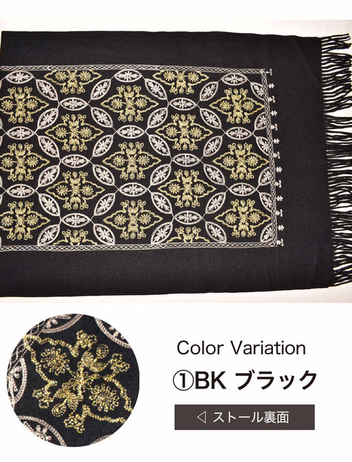 "顔周りを華やかに彩る” エレガントなパターン刺繍ストール。 肌寒い季節の必須アイテム!上品なパターン柄の刺繍が全体に施された、贅沢な大判ストールです。 シンプルな着こなしも、巻くだけでおしゃれにワンランク上に見せてくれます。