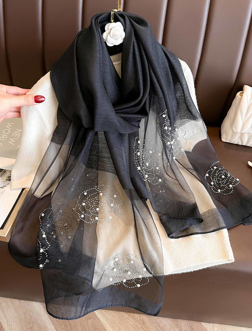 ふわりと纏う、パールが咲くオーガンジーストール。 軽やかな透け感が美しいオーガンジーに、パール使いの花モチーフをあしらった華やかな一枚。 ふんわりとした素材感が顔まわりを優しく包み、上品でフェミニンな印象をプラスします。