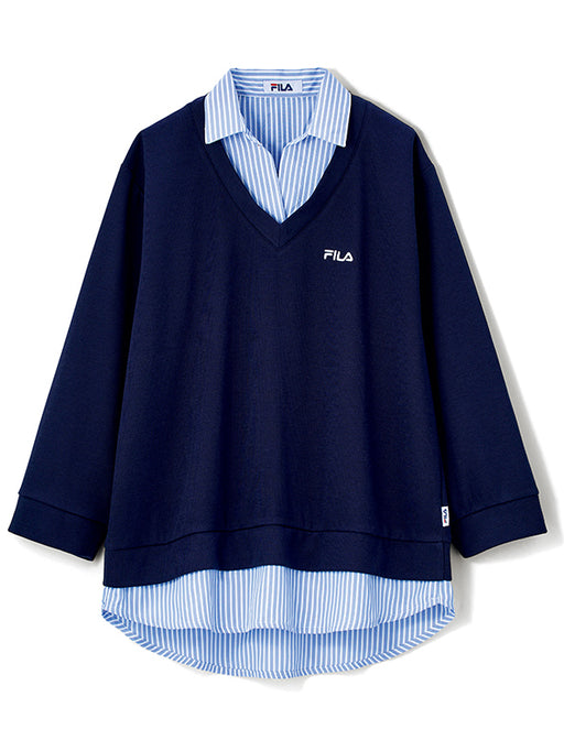 そのまま「重ねる」感覚、シャツ × カットソーの理想形。 シャツの清楚さとカットソーの快適さを掛け合わせ、気負わずおしゃれに見せる一着。 ピンストライプのシャツをレイヤードしたことで、ロング丈でも重く見えず軽やかな印象に。