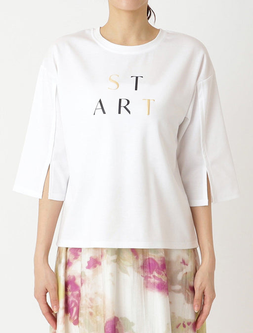 程よい光沢とハリのあるポンチローマ素材を使用し、上品な印象に。<br>発泡プリントのロゴがアクセントになり、袖スリットでデザイン性と機能性を両立。<br>テーパードパンツやワイドボトムスと合わせて、洗練されたカジュアルスタイルが楽しめます。