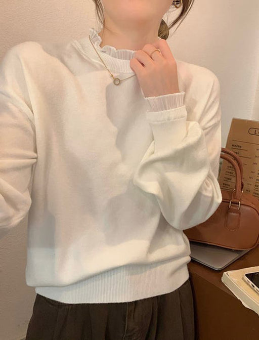 繊細なレースフリルが襟元と袖口を彩る、上品な重ね着風ニット。<br>ぽわんとしたランタンスリーブが女性らしいシルエットを演出。<br>1枚で華やかさが際立つ、フェミニンな着こなしを楽しめる一着です。